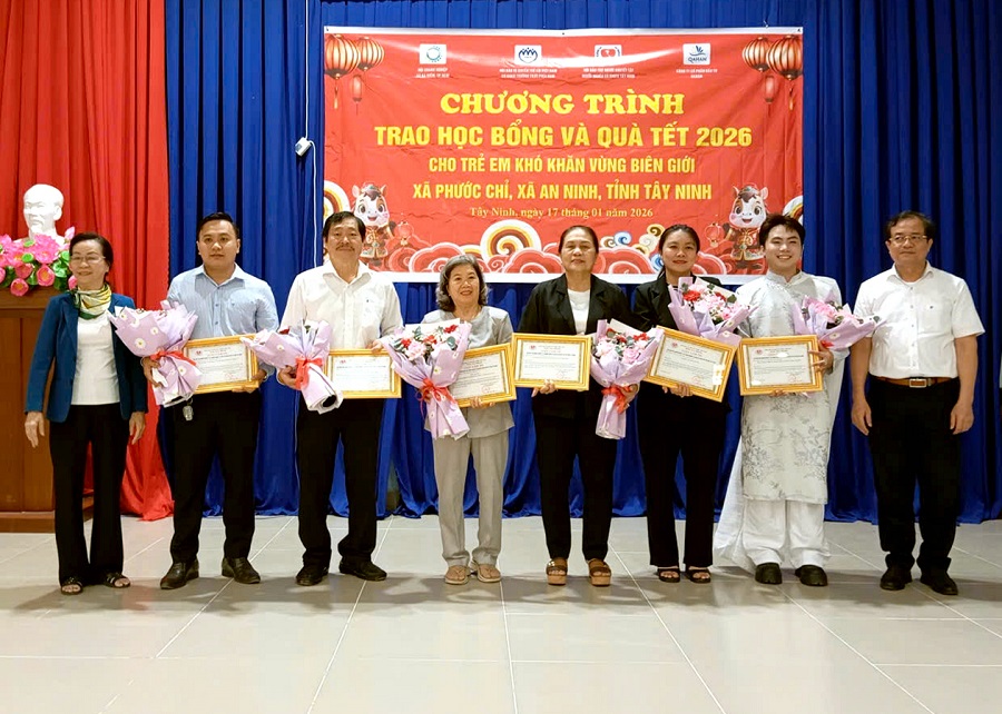 Sáng ngày 17.01.2026, tại Trung tâm Văn hoá Thể thao và Học tập công đồng xã Phước Chỉ, Hội Bảo trợ người khuyết tật, người nghèo và bảo vệ quyền trẻ em tỉnh Tây Ninh (gọi tắt là Tỉnh Hội) đã phối hợp cùng Hội Bảo vệ quyền trẻ em Việt Nam (gọi tắt là Trung ương Hội) tổ chức trao học bổng và quà Tết-2026 cho học sinh nghèo khó khăn xã Phước Chỉ và xã An Ninh (vùng biên giới tỉnh Tây Ninh)