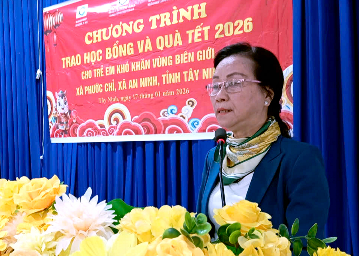 Thay mặt Trung ương Hội, bà Trần Thị Thu Hà – Phó Trưởng cơ quan thường trực phía Nam nêu lên mục đích chuyến đi đến Tây Ninh của đợt trao quà năm nay có ý nghĩa nhân văn sâu sắc; mỗi món quà tuy không là bao chỉ mong chan sẻ, là niềm vui cho những trẻ em nghèo tại vùng biên giới. Đây là niềm vui không chỉ đối với các cháu thiếu nhi mà còn là của những người làm công tác từ thiện. thể hiện truyền thống tốt đẹp của dân tộc và sự quan tâm đặc biệt của cả cộng đồng đến những học sinh nghèo, có hoàn cảnh đặc biệt khó khăn với những phần quà quý báu nghĩa tình trong ngày Tết cổ truyền của dân tộc. Đồng thời, bà tỏ lời thăm hỏi, chúc sức khoẻ các thầy cô giáo, các em học sinh, các vị đại biểu cùng chính quyền địa phương hưởng một mùa xuân Bính Ngọ – 2026 đầm ấm nghĩa tình,