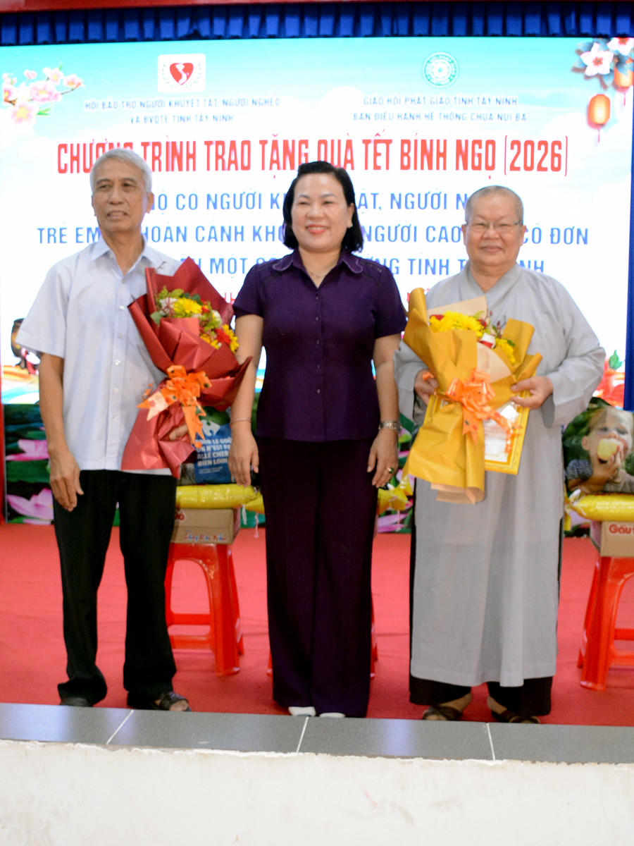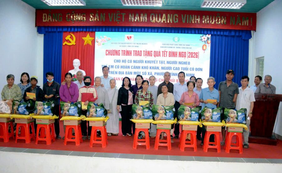 Sáng ngày 28/01/2026, Hội Bảo trợ người khuyết tật, người nghèo và Bảo vệ quyền trẻ em Tây Ninh (Tỉnh Hội Tây Ninh) phối hợp cùng Ban điều hành hệ thống chùa Núi Bà tổ chức chương trình “Trao tặng quà Tết Bính Ngọ – 2026” cho các hộ dân có người khuyết tật, người nghèo, người cao tuổi cô đơn tại các xã Ninh Điền, Hảo Đước, Trà Vong và xã Tân Lập.