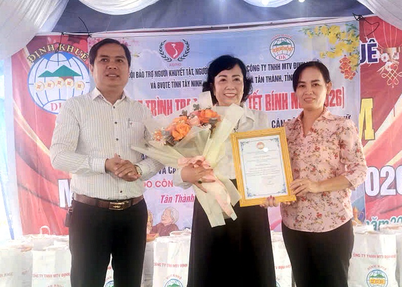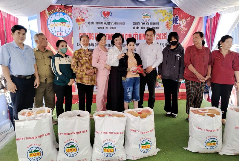 Tiếp tục thực hiện chương trình quà Tết đối với các hộ dân vùng sâu vùng xa có hoàn cảnh đặc biệt khó khăn, sáng ngày 04/02/2026 vừa qua tại xã Tân Thành, Hội Bảo trợ người khuyết tật, người nghèo và Bảo vệ quyền trẻ em tỉnh Tây Ninh (Tỉnh Hội Tây Ninh) phối hợp Công ty TNHH MTV Định Khuê (Công ty Định Khuê) tổ chức chương trình “Trao tặng quà Tết Bính Ngọ – 2026” cho các hộ dân có hoàn cảnh khó khăn tại địa phương.