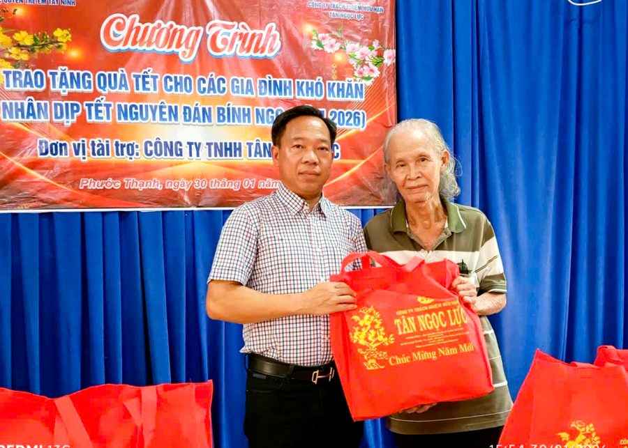 Chiều ngày 30/01/2026, Hội Bảo trợ người khuyết tật, người nghèo và Bảo vệ quyền trẻ em Tây Ninh (Tỉnh Hội Tây Ninh) phối hợp cùng Công ty TNHH Tân Ngọc Lực tổ chức chương trình trao tặng 100 suất quà Tết cho các hộ dân có hoàn cảnh khó khăn tại xã Phước Thạnh, tỉnh Tây Ninh.